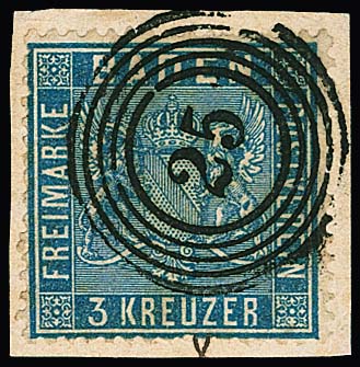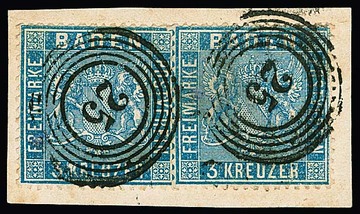 3 Kr. schw./blau, weitgehend vollrandig, mit hierauf besserer Entwertung durch Orts-K2 "Kehl", Mi. 1200,-