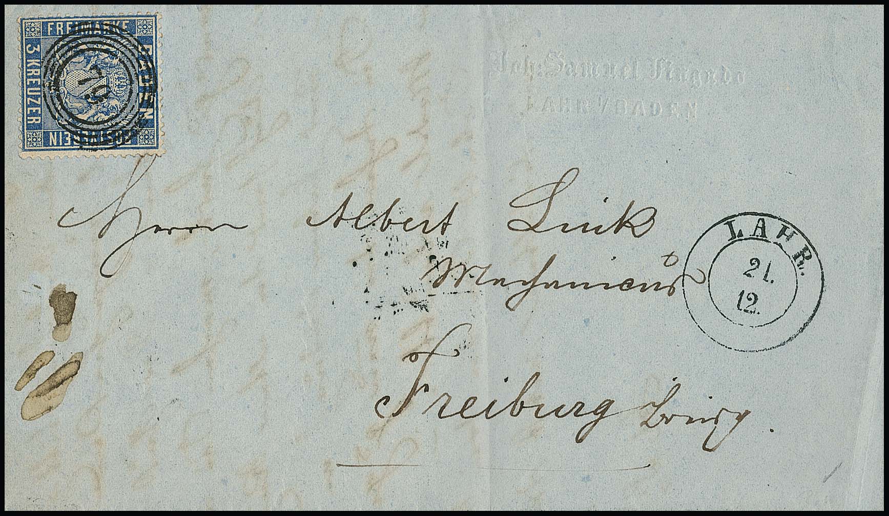 3 Kr. veilchenblau auf Prachtbrief aus Lahr, sign. mit Befund Englert. Mi. 600,-