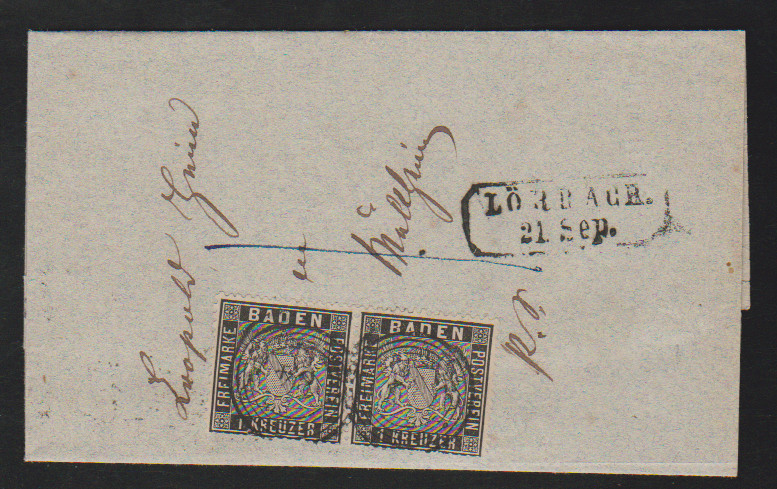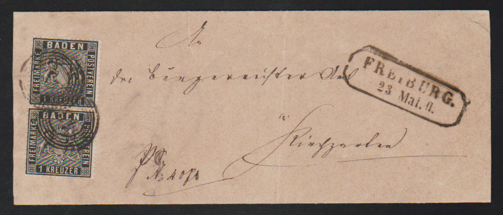 1 Kr. schwarz, zwei Briefe mit Paar-Frankaturen, aus Freiburg (Brief kl. Einriß, Paar gut) bzw. Lörrach (ein Wert kl. Zahnspalt)