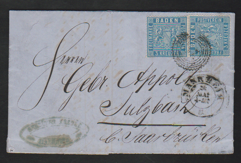 3 Kr. preußischblau per zwei auf Prachtbrief von Mannheim (Zackenkranz-NS "87") nach Sulzbach bei Saarbrücken