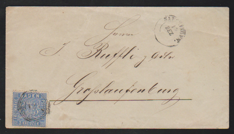 3 Kr. ultramarin einzeln auf Pracht-Grenzrayon-Couvert von Säckingen ins Schweizer Großlaufenburg, sign. Englert, Flemming