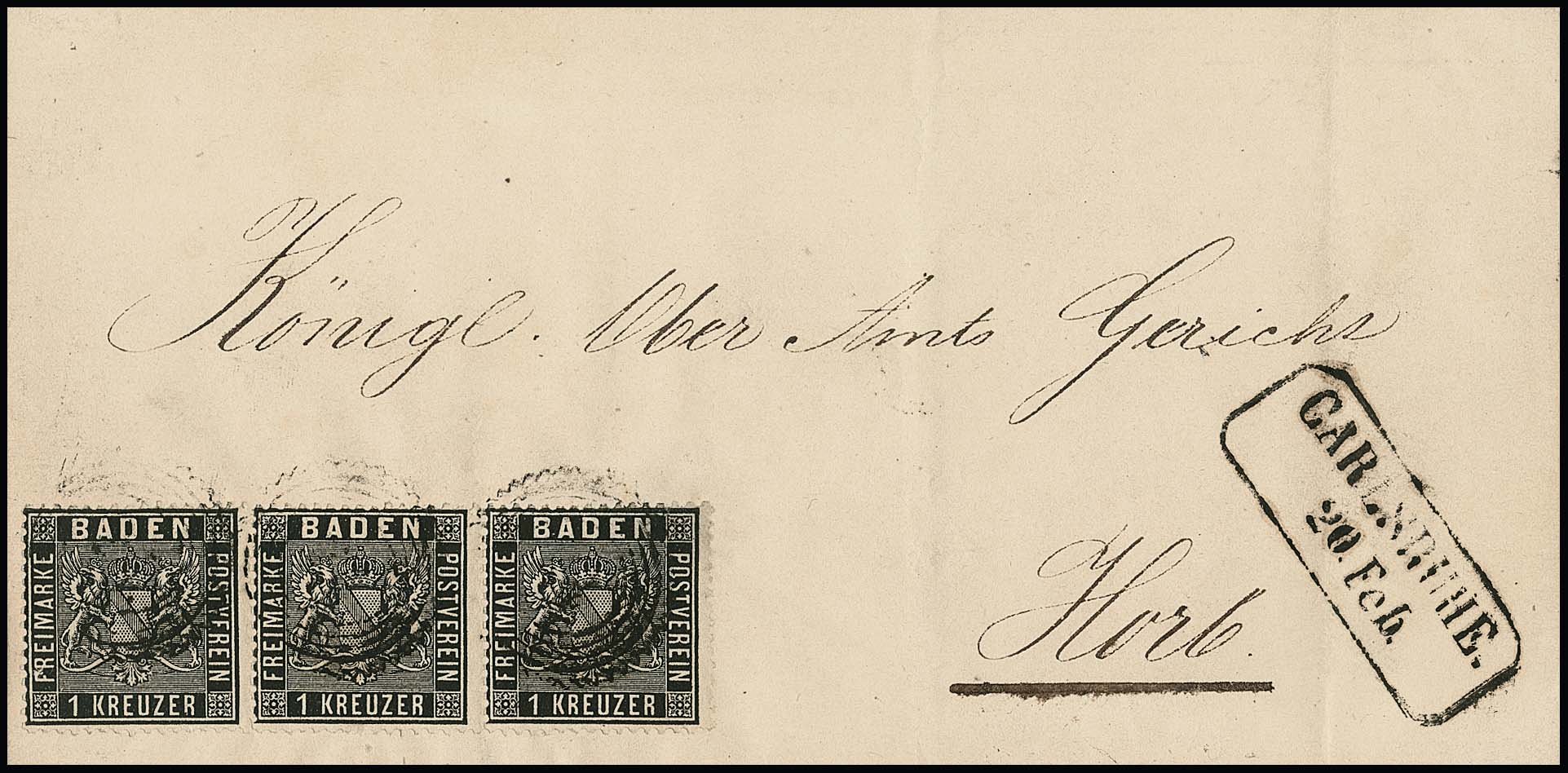 1 Kr. schwarz, drei Kabinettstücke mit Zackenkranz-NS "24" und Ra2 "Carlsruhe" auf Brief nach Horb