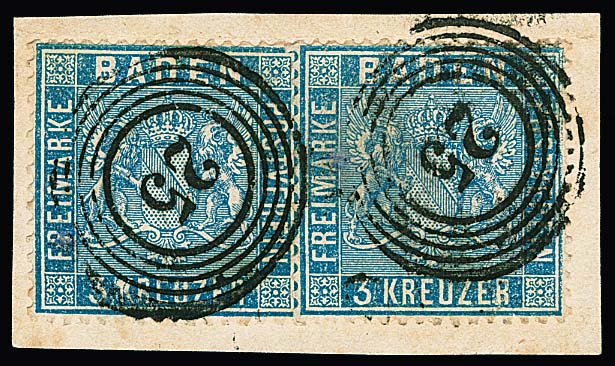 3 Kr. preußischblau, rote Versuchs-Gummierung, zwei Exemplare auf Kabinettbriefstück mit NS "25" (Constanz), dopp. sign. Seeger. Mi. 900,- +