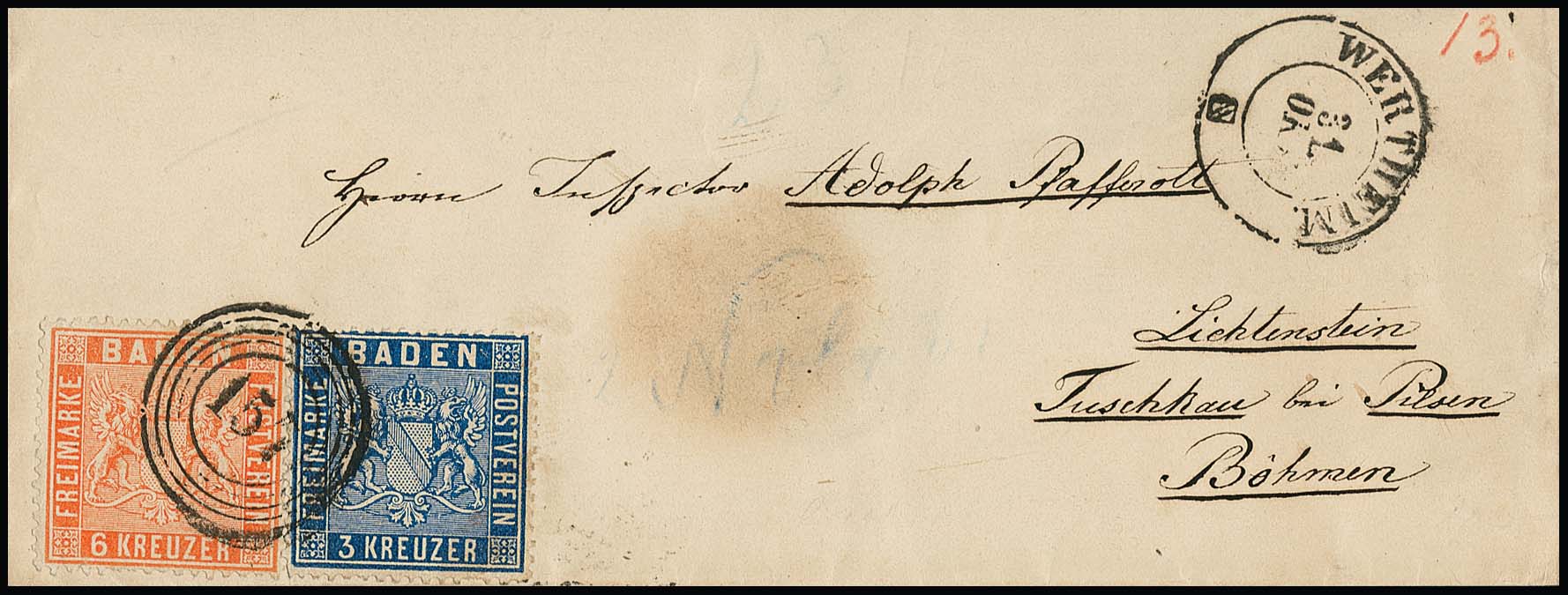 3 Kr. veilchenblau nebst 6 Kr. lachsrot, ausgabetypisch gezähnt, prachtvolle 9 Kr.-Frankatur auf schmalformatigem, rs. nicht ganz kpl. Damencouvert nach Bömen, klare NS "157" und K2 "Wertheim". Buntfrankaturen mit der veilchenblauen 3 Kr. sind nicht häufig
