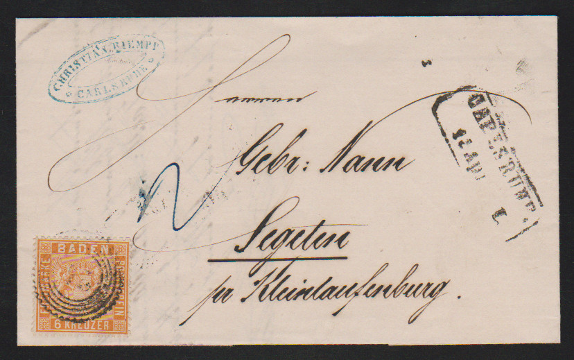 6 Kr. orange, perfekt gezähnt, auf Kabinettbrief mit Zackenkranz-NS "24" und Ra2 "Carlsruhe". Mi. 300,- +