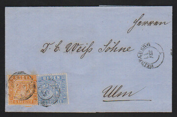 6 Kr. schw./gelborange, zwei meist vollrandige Exemplare auf innerbadischem Brief von Heidelberg nach Constanz
