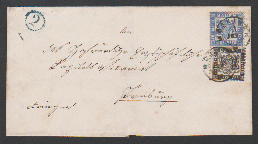 1 Kr. schwarz und 6 Kr. blau auf Brief (leichte Gebrauchsspuren) mit K2 "Möskirch" und blauem Uhrradstempel "2"