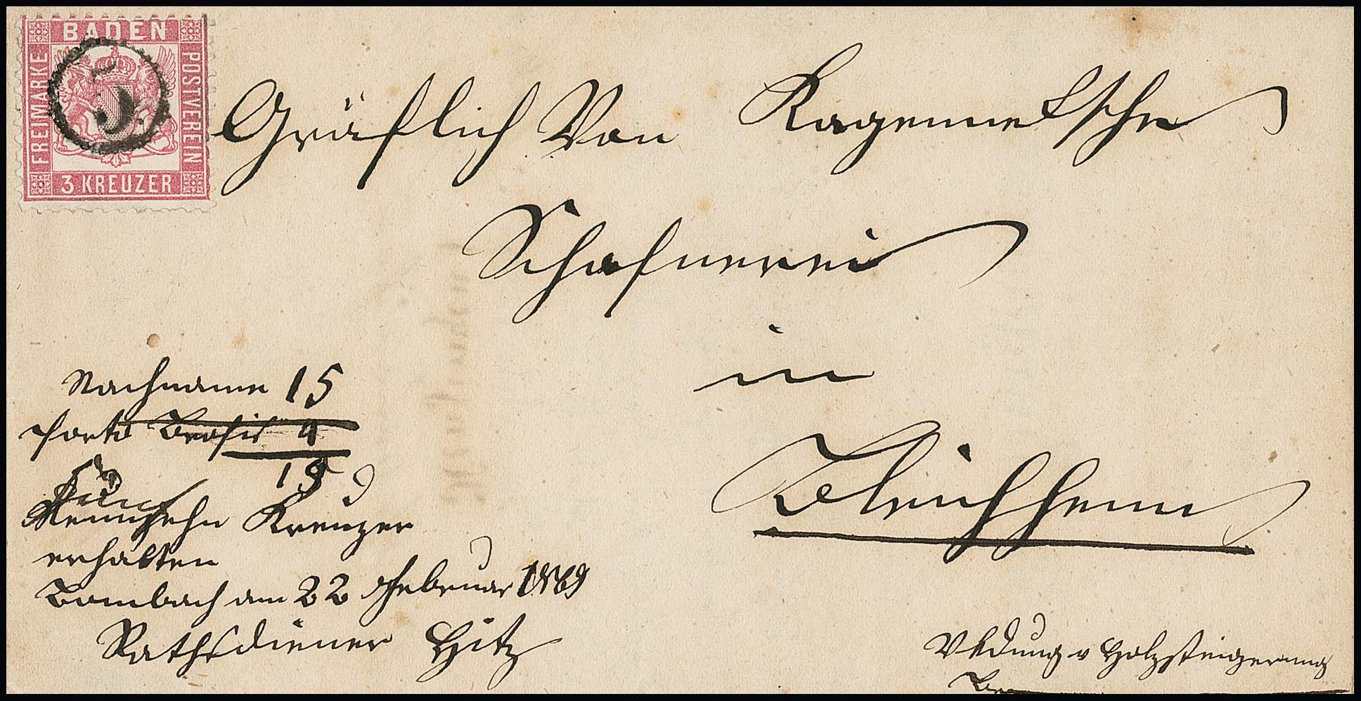 3 Kr. rosa (zwei unbedeutend verkürzte Zähne) auf Nachnahmebrief 1869 mit alleiniger Entwertung durch Uhrradstempel "5" von Bleichheim (Kenzingen)