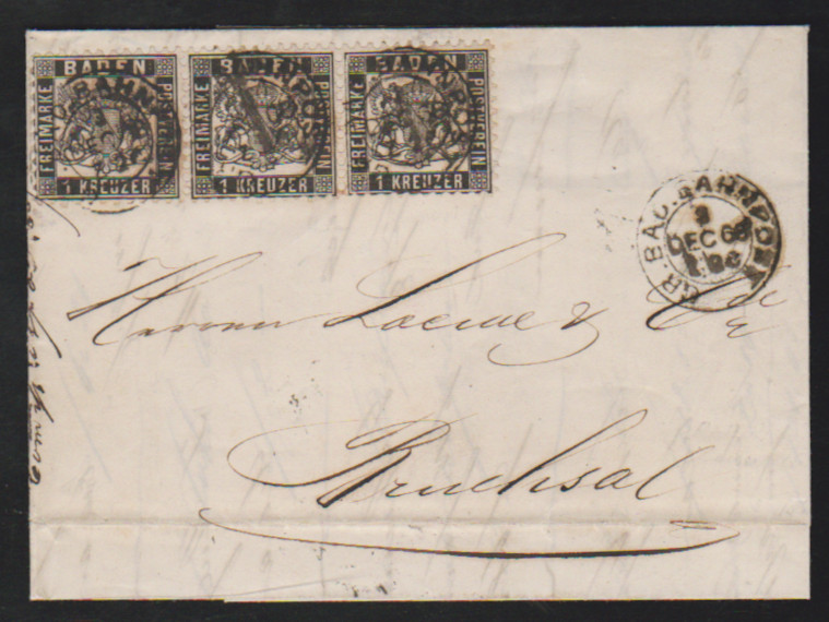 1 Kr. schwarz, waager. Dreierstreifen nur mit Bahnpost-K2 (eine Marke zusätzlich Federstrich) "Gr. Bad. Bahnpost" 1866 nach Bruchsaal, Inhalt aus Mülheim