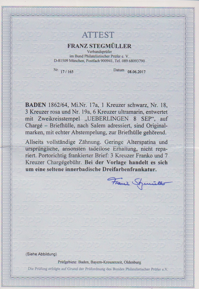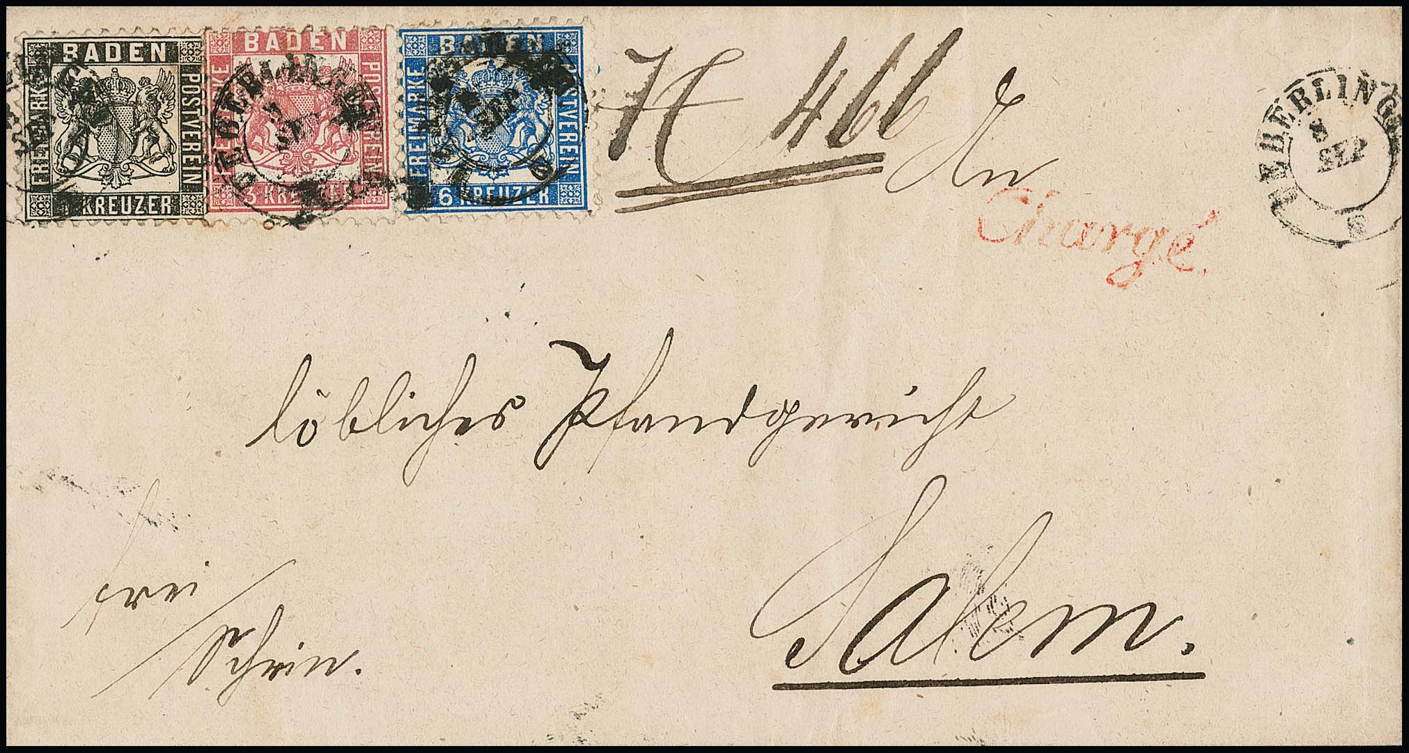 1 Kr. schwarz, 3 Kr. rosa und 6 Kr. ultramarin, perfekt gezähnte Dreifarben-Frankatur mit K2 "Ueberlingen" auf dekorativem Chargébrief (min. Patina) nach Salem. Seltene innerbadische Dreifarben-Kombination, Fotoexp. Stegmüller