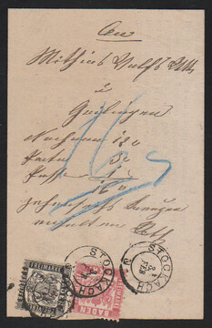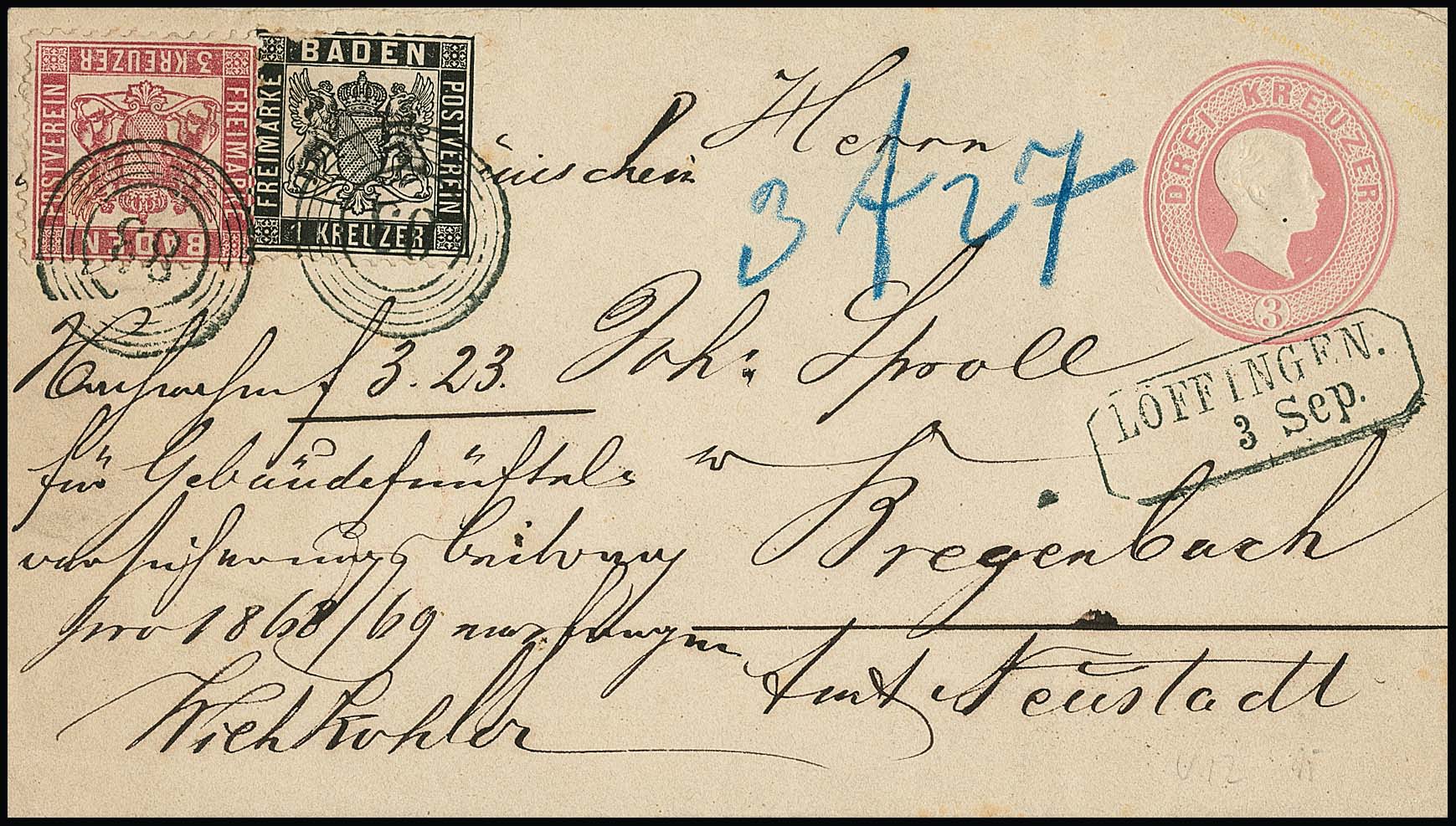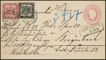 1 Kr. schwarz (oben etwas aufgerauht) nebst 3 Kr. karminrosa auf Ganzsache 3 Kr. blaßrosa als Nachnahmebrief nach Bregenbach/Neustadt, NS "83" und Ra2 "Löffingen"