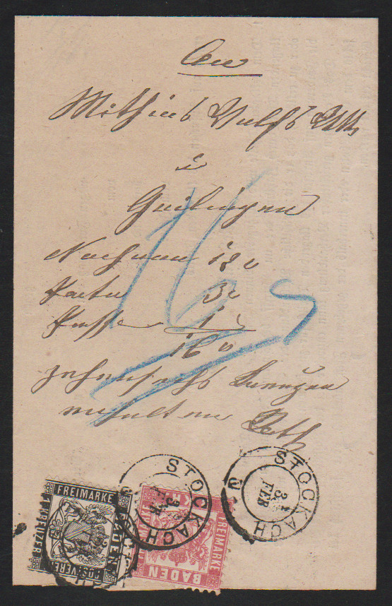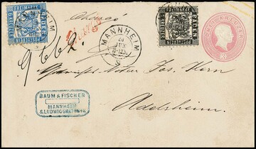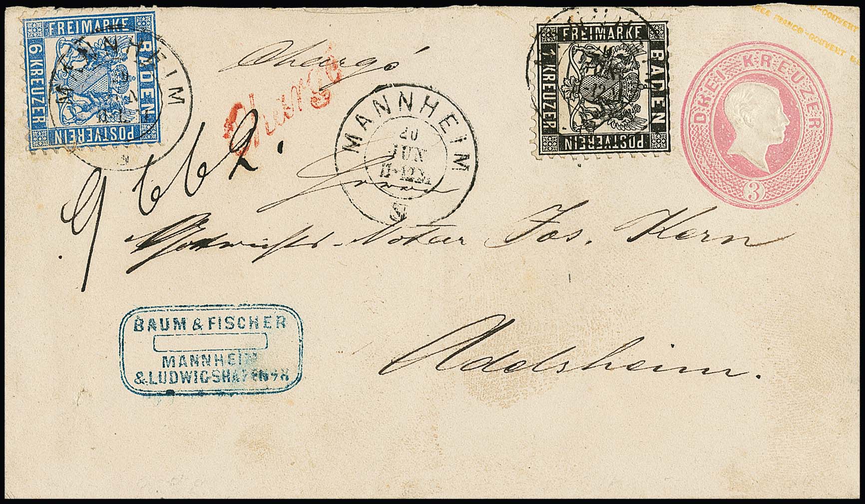 1 Kr. schwarz, Kabinettstück, nebst 6 Kr. ultramarin (Spalt) auf Ganzsache 3 Kr. rosa nach Adelsheim, K2 "Mannheim" und roter L1 "Chargé"