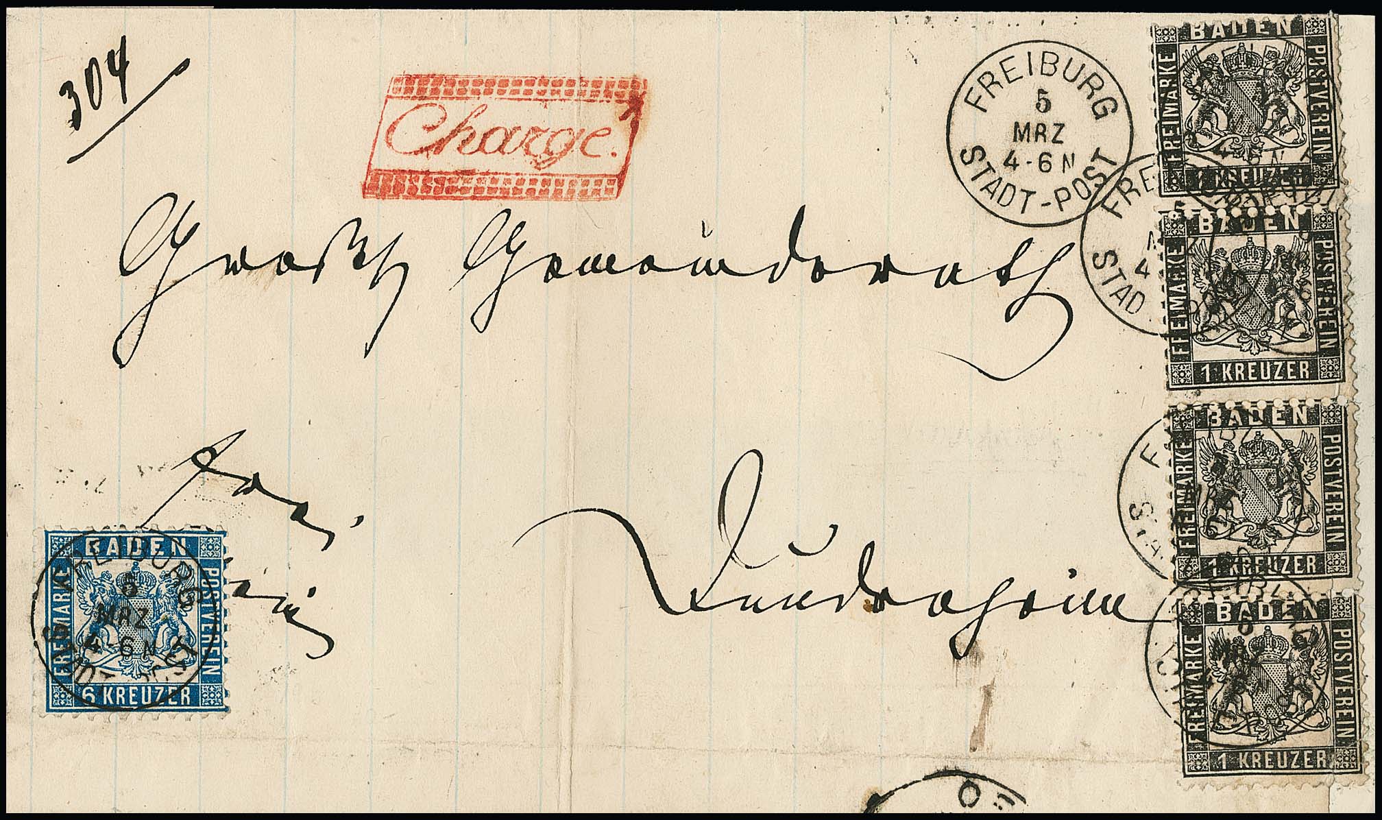 1 Kr. schwarz im senkrechten Viererstreifen, nebst 6 Kr. preußischblau, auf Chargébrief mit K1 "Freiburg Stadt-Post" und rotem Chargéstempel. Trotz Mängel eine einmalige Frankatur-Kombination