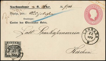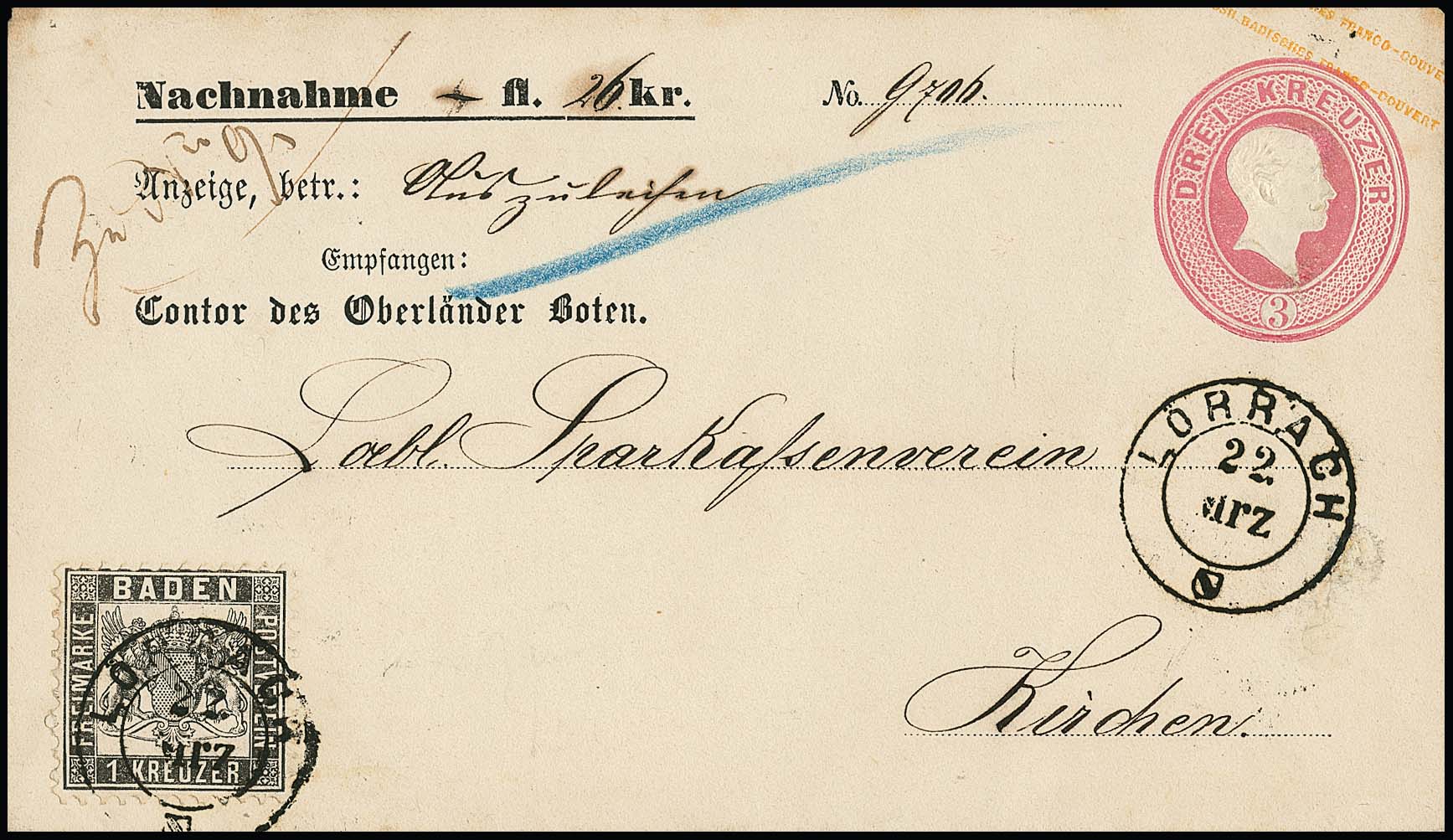 1 Kr. schwarz, Luxusstück mit K2 "Lörrach" auf teils vorgedrucktem Nachnahme-Ganzsachenumschlag 3 Kr. rosa