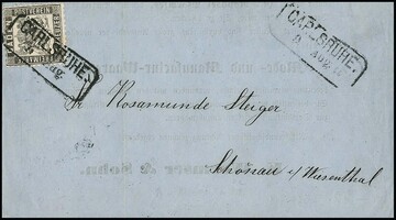 1 Kr. grauschwarz, Kabinettstück mit klarem Ra2 "Carlsruhe" auf gef. Firmen-Drucksache nach Schönau/Wiesenthal, befördert über Basel, Badischer Bahnhof, sign. Brettl. Mi. 800,-