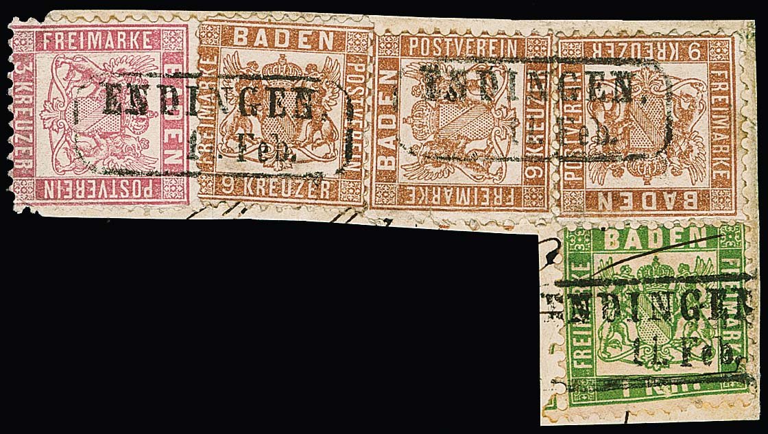 3 Kr. rosa und dreimal 9 Kr. rötlichbraun in Mischfrankatur mit 1 Kr. grün auf Briefstück mit Ra2 "Endingen", kl. Zf.