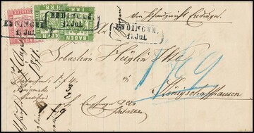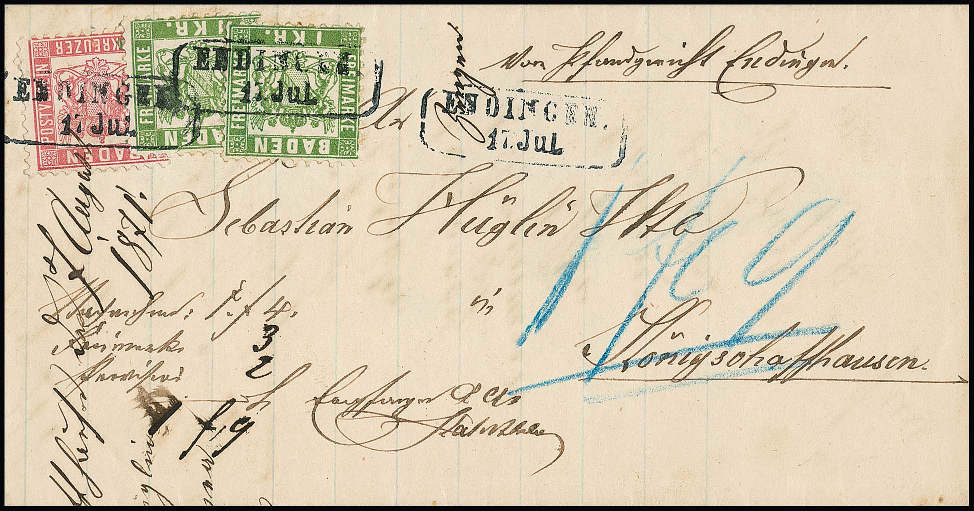 3 Kr. rosa in Mischfrankatur mit zweimal 1 Kr. grün (einmal etwas "eckrund") auf Brief mit schwarzblauem Ra2 "Endingen" nach Königschaffhausen