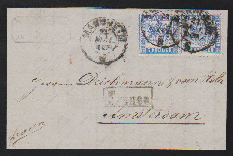 6 Kr. blau im Paar auf Kabinettbrief von Mannheim (K2) nach Amsterdam 1868
