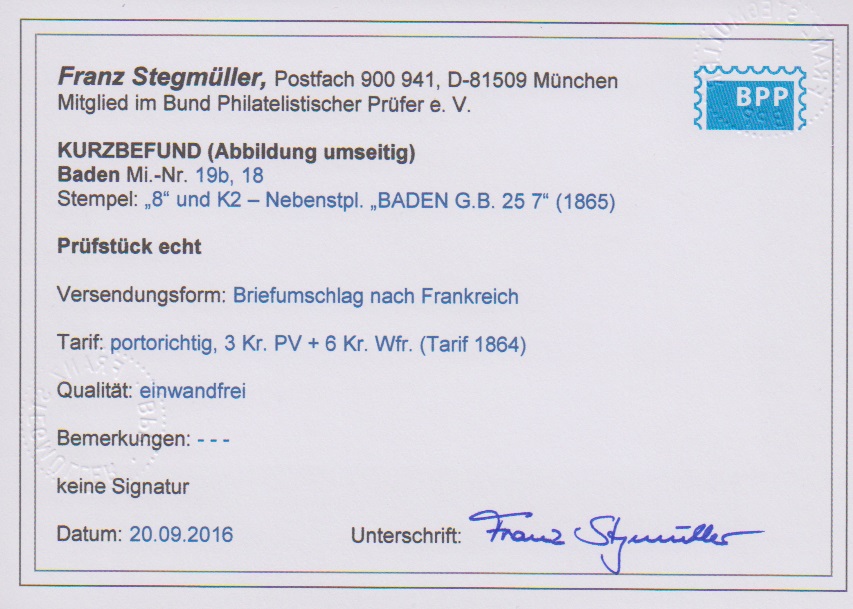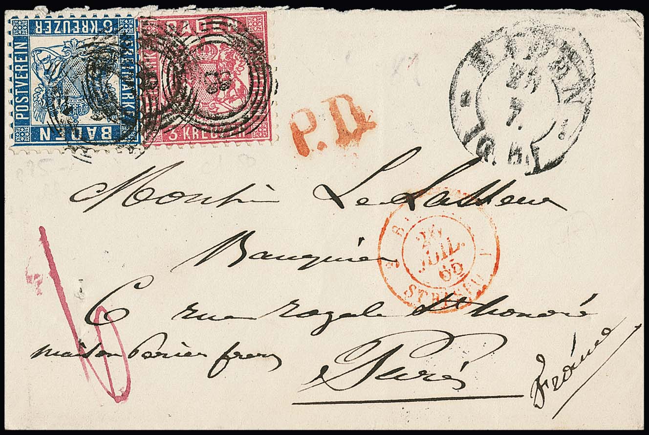 3 Kr. rosa und 6 Kr. preußischblau auf Prachtcouvert mit NS "8" und K2 "Baden" nach Paris, Fotoexp. Stegmüller