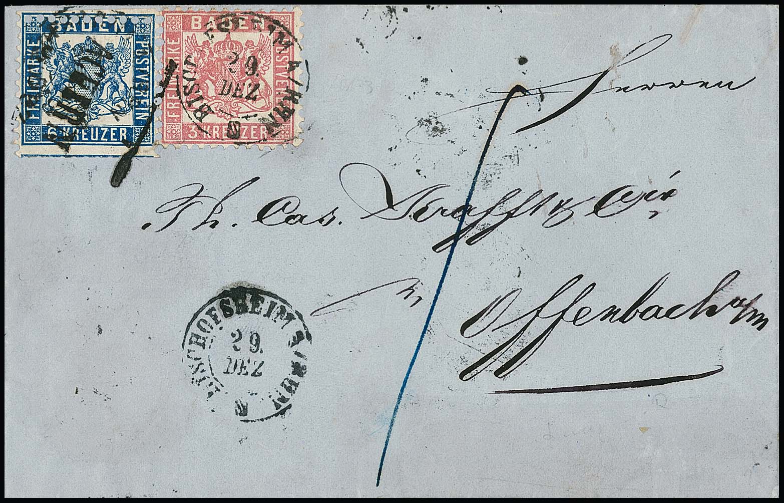 3 Kr. rosa und 6 Kr. preußischblau (unten verkürzte Zähne) auf Brief mit K2 "Bischofsheim", und 6 Kr. zusätzlich mit L2 "Achern", nach Offenburg