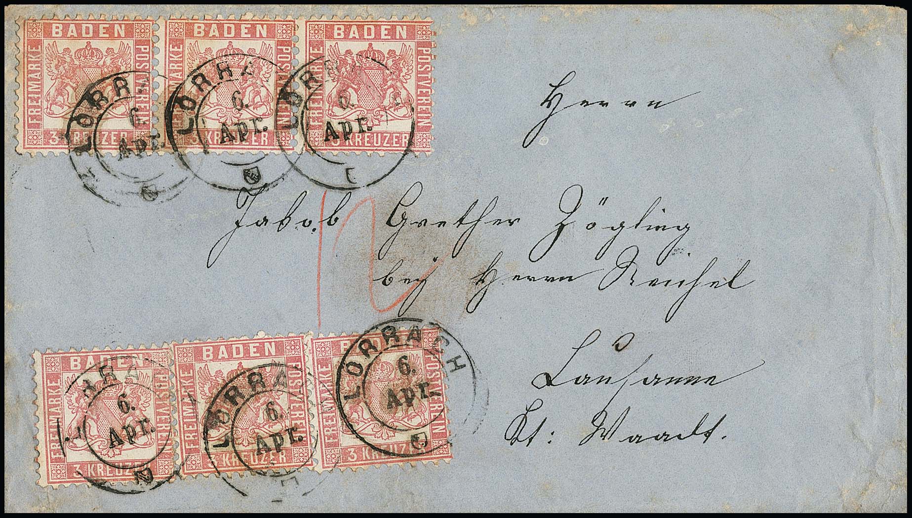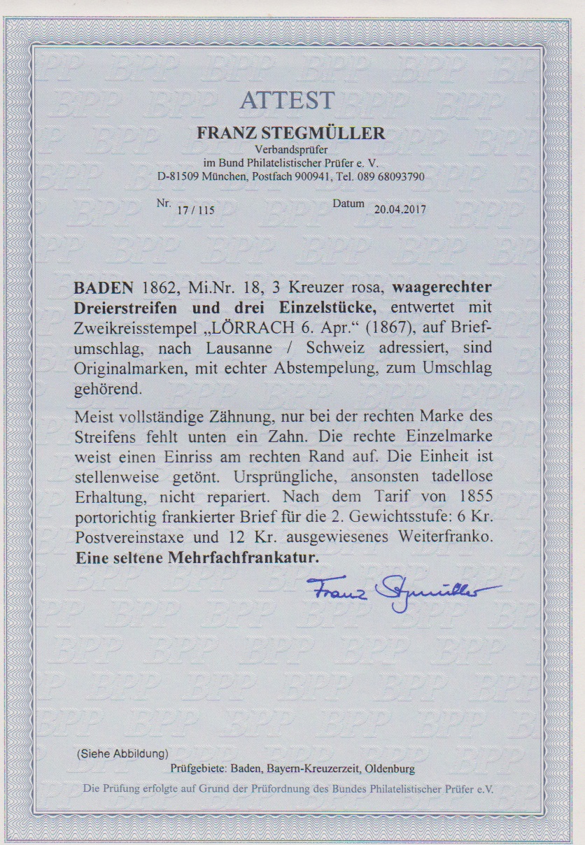 3 Kr. hellrosa, waagerechter Dreierstreifen und drei Einzelstücke als ungewöhnliche Mehrfach-Frankatur auf Couvert in der 2. Gewichtsstufe nach Lausanne, K2 "Lörrach", zwei Marken mit kl. Unebenheiten und Beförderungsspuren, Fotoattest Stegmüller