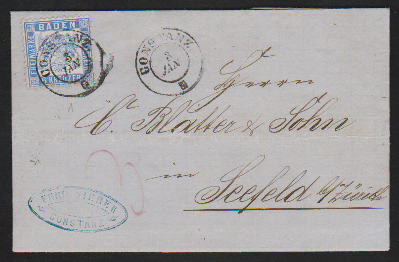6 Kr. blau auf Luxusbrief mit K2 "Konstanz" nach Seefeld/Zürich mit Weiterfranko "3", sign. Stegmüller