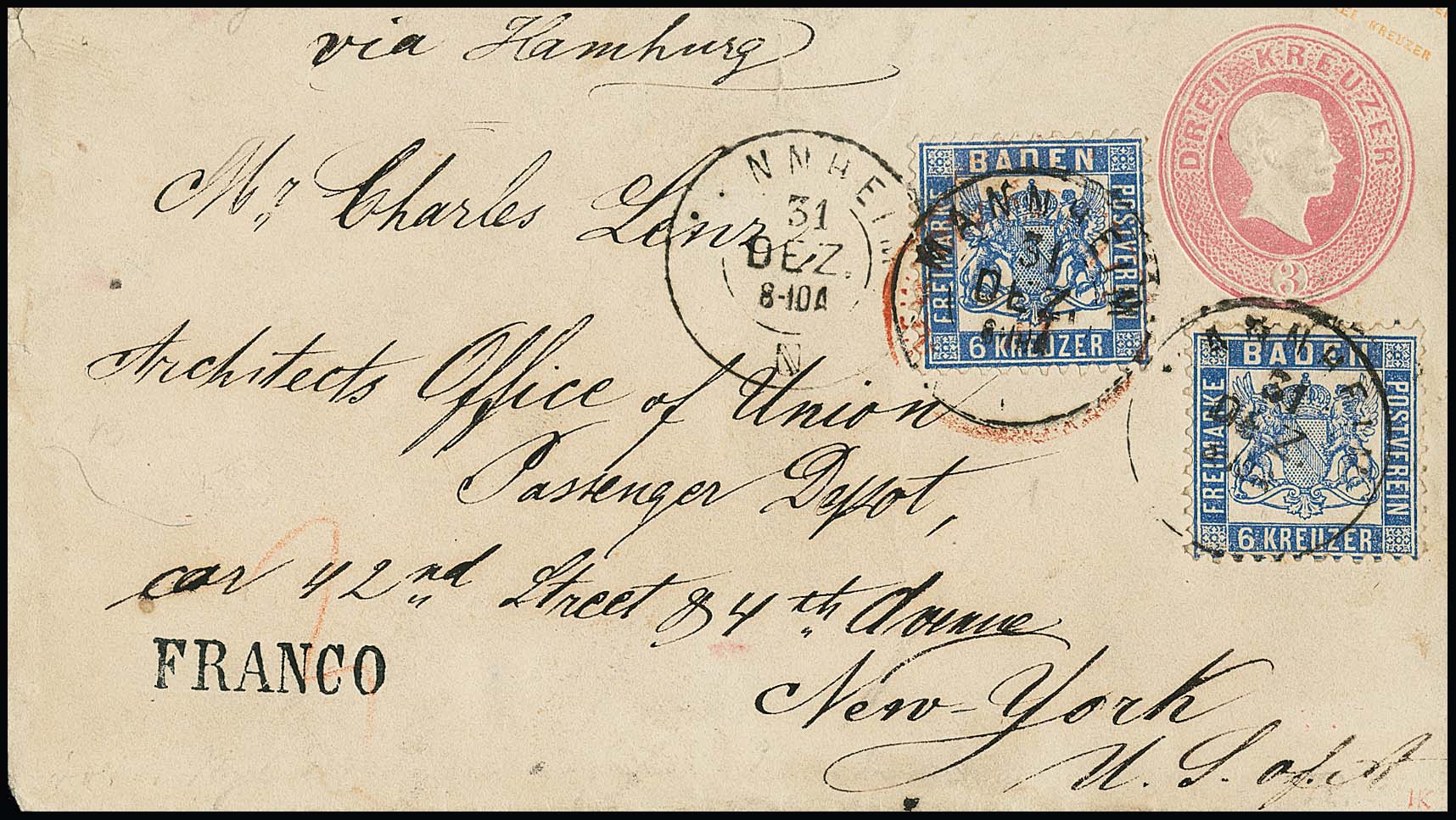 6 Kr. hellultramarin, zwei frische Exemplare (einmal kl. Spalt) mit K2 "Mannheim" auf oben leicht verkürztem Ganzsachenumschlag 3 Kr. blaßrosa nach New York, Leitvermerk "via Hamburg", einmal der rote Transitstempel exakt überlappend mit dem Ortsstempel auf der Marke. Eine seltene 15-Kreuzer-Kombination, sign. Krause