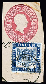 6 Kr. ultramarin auf Kabinett-Ganzsachen-Abschnitt 3 Kr. rosa mit K2 "Kehl", sign. Stegmüller