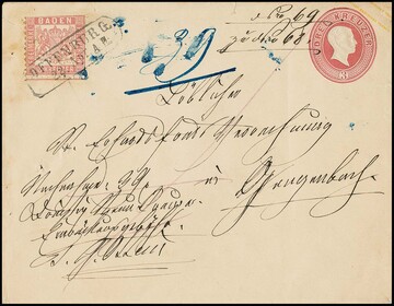 3 Kr. rosa per vier (drei durch Randklebung etwas bestoßen bzw. kleine Zahnfehler) auf Ganzsache 3 Kr. rosa, mit K2 "Emmendingen" 1867 nach Angers/Frankreich. Seltene Kombination, lt. Attest Stegmüller "bisher nur drei weitere Ganzstücke bekannt"