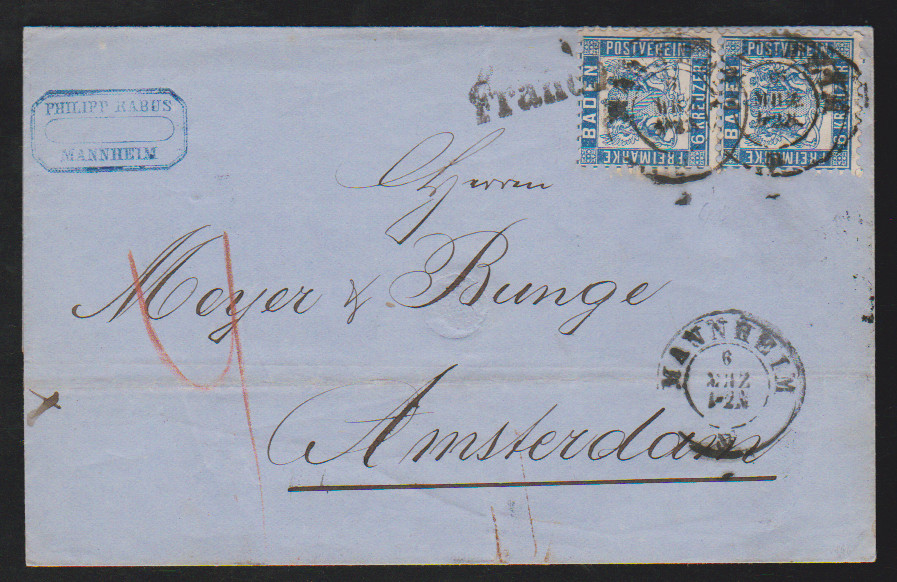 6 Kr. preußischblau, Prachtpaar mit K2 "Mannheim" auf Brief (Faltspur ausserhalb) 1866 nach Amsterdam