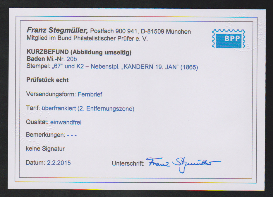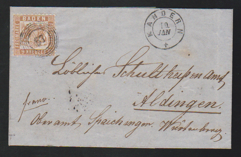 9 Kr. gelbbraun einzeln auf überfrankiertem (!) Prachtbrief mit NS "67" und K2 "Kandern" 1865 ins württembergische Aldingen, Fotoexp. Stegmüller