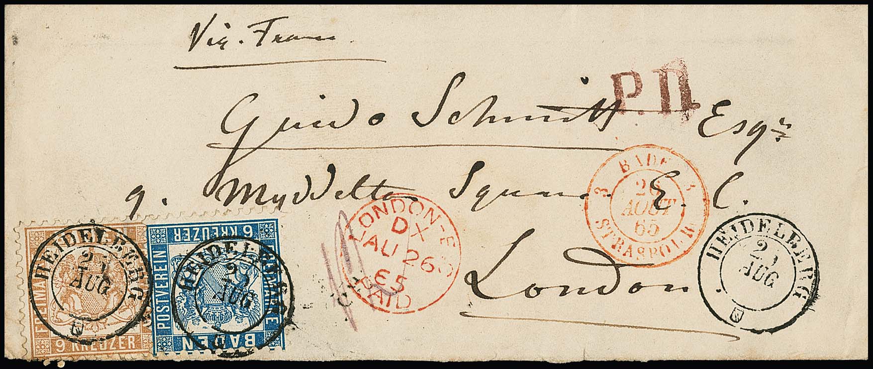 6 Kr. blau und 9 Kr. rotbraun auf Damencouvert von Heidelberg 1868 nach London, hs. "ungenügend" und nachtaxiert, u.a. seltener Taxstempel "1 Fr. 76 C.", kleine Gebrauchsmgl.