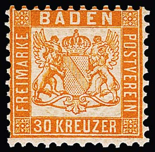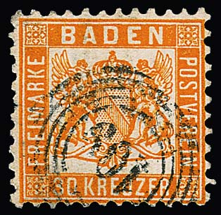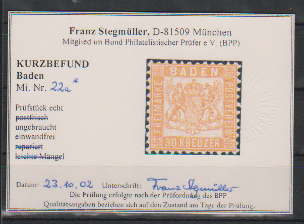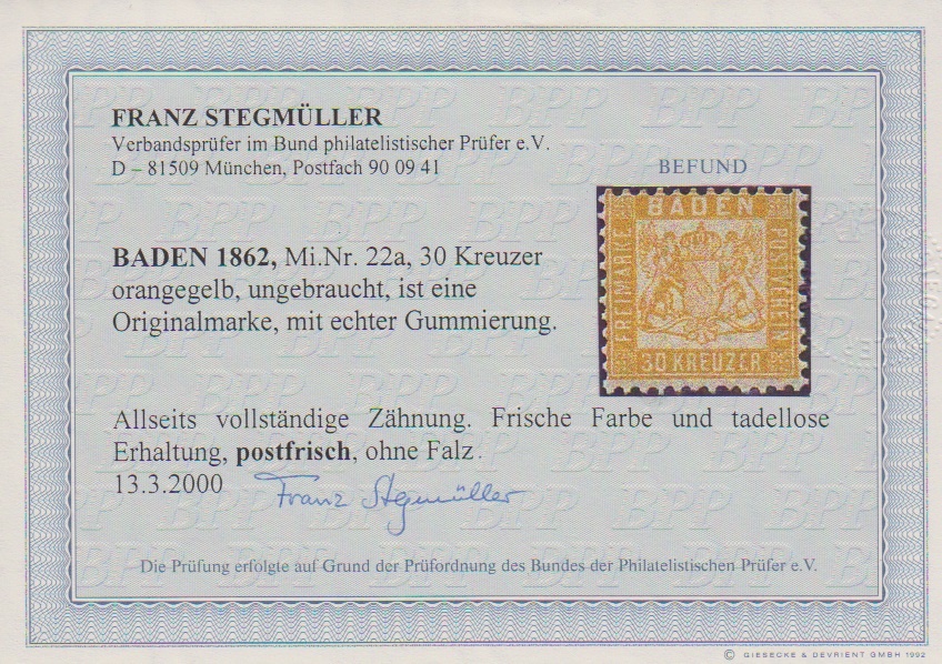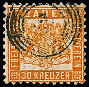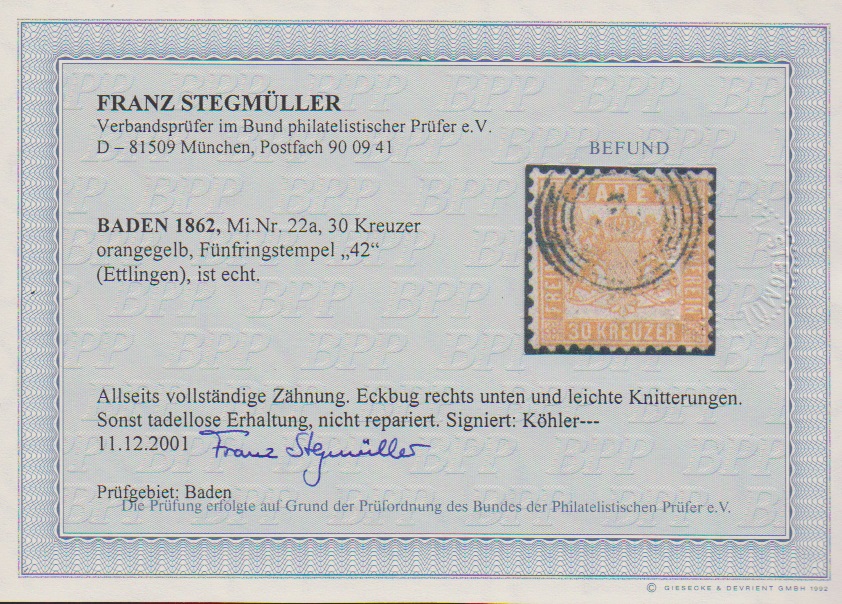 30 Kr. orangegelb, prachtvolles und gut gezähntes Exemplar mit NS "42" (Ettlingen), leichter Eckbug bzw. Knitterungen, sonst in tadelloser Erhaltung und nicht repariert, sign. Köhler, Fotoexp. Stegmüller. Mi. 3000,-