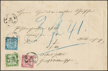 1 Kr. grün, 3 Kr. rosa und 7 Kr. hellblau, perfekte Exemplare auf Nachnahmecouvert (Faltspuren ausserhalb) mit K1 "Carlsruhe" nach Altbreisach, 10. Nov. (1871). In Verbindung mit der Nr. 25b wahrscheinlich Frankatur-Unikat, wie auch das Attest Brettl bestätigt. Ex Koch (Zuschlag 1993 SFr. 3800,-)