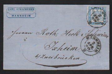6 Kr. preußischblau, Kabinettstück mit K2 "Mannheim" auf Faltbrief in die Bayerische Pfalz