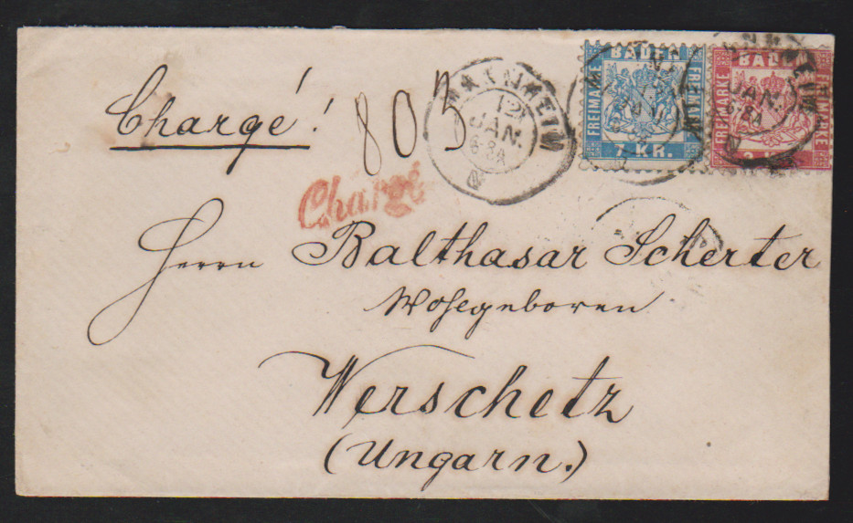 3 Kr. karmin (ein Zahn) und 7 Kr. blau auf Postvereins-Reco-Couvert von Mannheim nach Verschetz/Ungarn