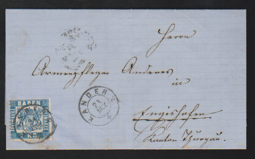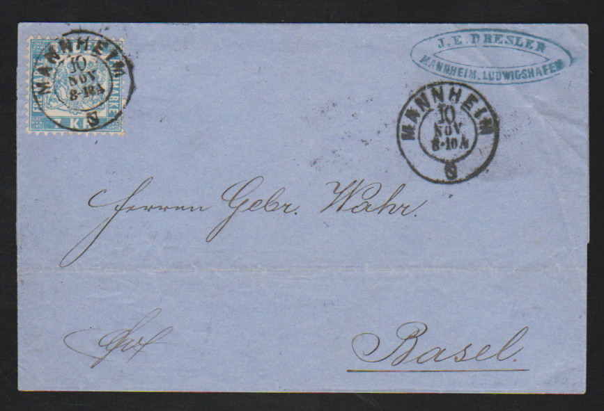 7 Kr. hellblau, Luxusstück mit idealem K2 "Mannheim" auf Faltbrief nach Basel/Schweiz. Mi. 380,- +