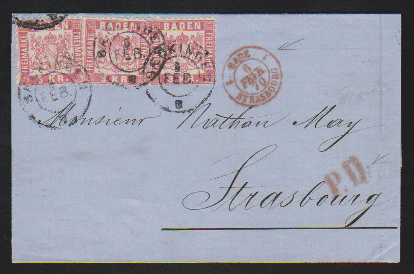 3 Kr. rosa per drei auf Prachtbrief mit K2 "Saeckingen" 1870 nach Straßburg