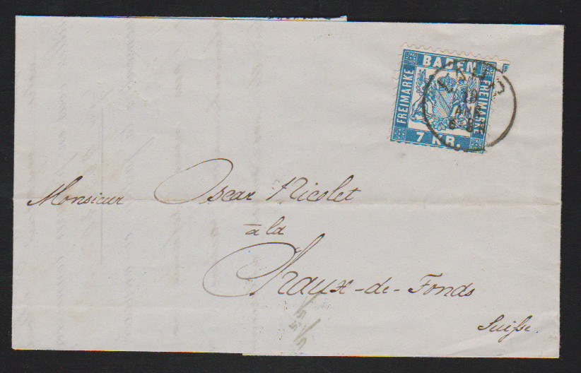 7 Kr. blau, Kabinettstück mit K1 "Lahr " auf Brief in die Schweiz