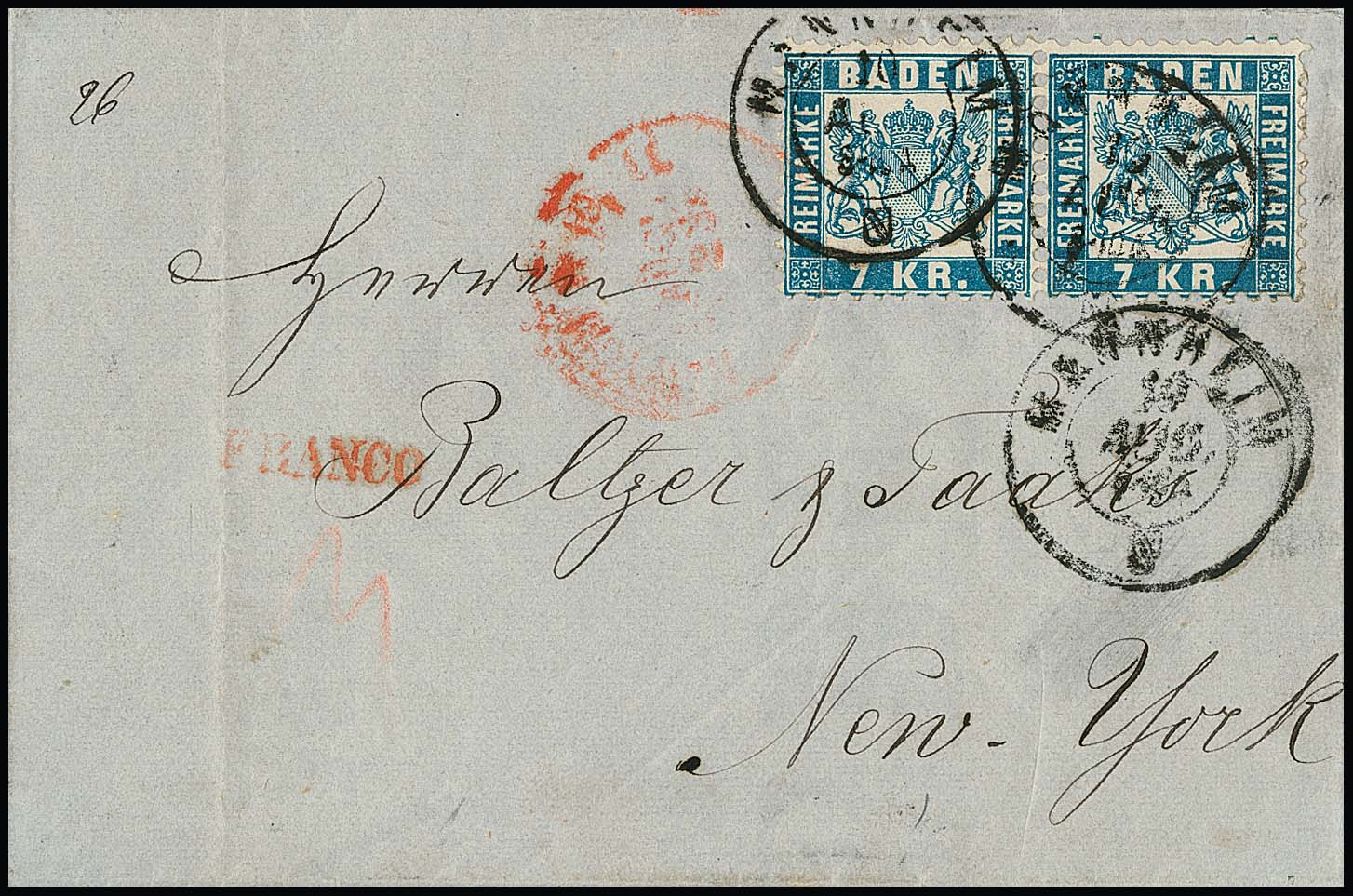 7 Kr. blau, waager. Kabinettpaar mit K2 "Mannheim" auf Brief nach New York 1870