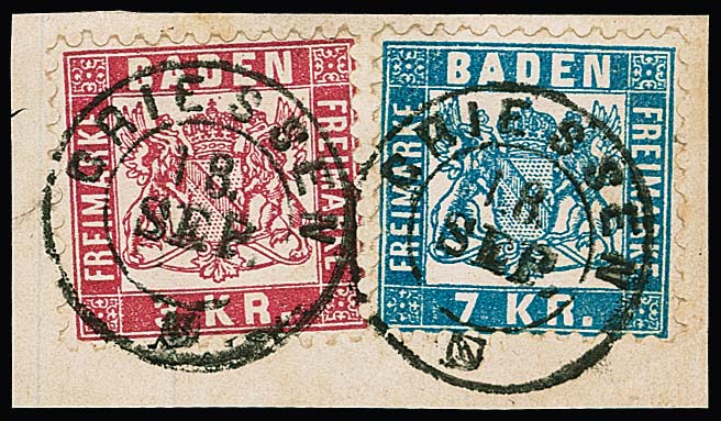1 Kr. grün, 3 Kr. rosa (unten zwei kurze Zähne) und zweimal 7 Kr. hellblau als ungewöhnliche Kombination auf prachtvollem Briefstück mit K2 "Bruchsal" (aus Dez. 1871)