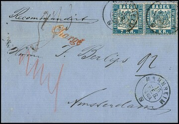 7 Kr. blau, zwei Prachtstücke auf gef. Recobrief mit K2 "Mannheim" 1871 nach Amsterdam