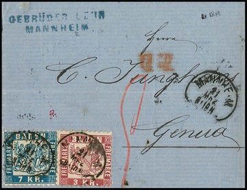 3 Kr. rosa und 7 Kr. blau, Prachtstücke auf gef. Brief von Mannheim (K1) 1870 nach Genua/Italien