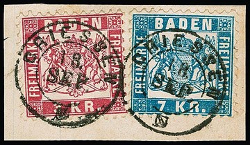 1 Kr. grün und 3 Kr. rosa, Prachtstücke auf Ganzsache 3 Kr. rosa, mit K1 "Carlsruhe" nach Basel, leichte Gebrauchsspuren