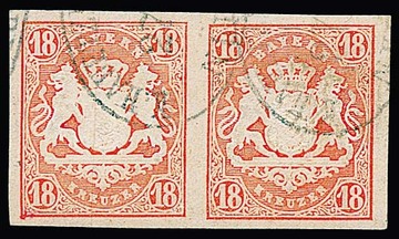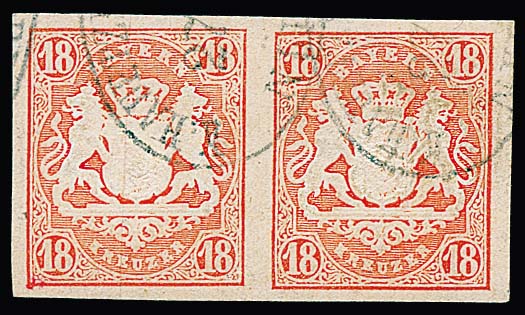 18 Kr. zinnoberrot, sehr breitrandiges waager. Prachtpaar mit Zeitungsovalstempeln von Nürnberg, sign. Engel, Hartmann. Mi. 1200,-