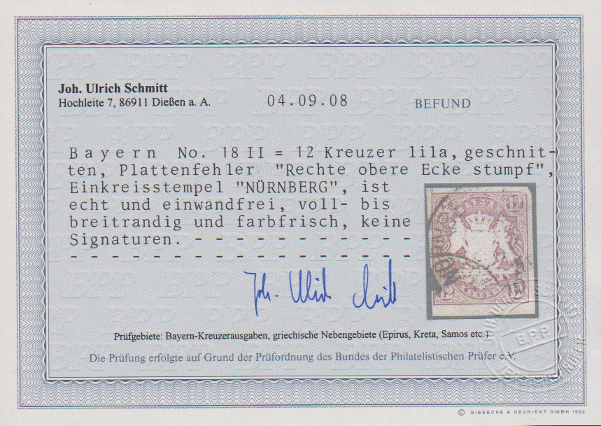 12 Kr. purpur, Plattenfehler "linke untere 2 verstümmelt", K1 von Lindau, sowie 18 Kr. zinnoberrot, zwei gestempelte Kabinettstücke, sign. Pfenninger bzw. Brettl. Mi. 520,-