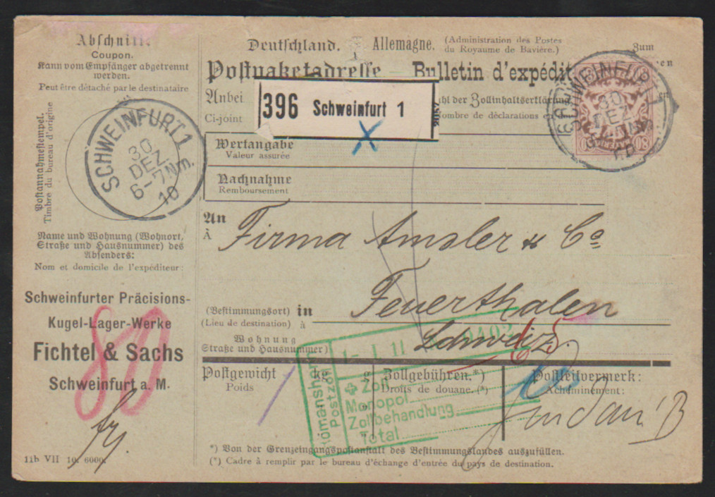 1 Mk. braunpurpur, gute Erstauflage, nebst 10 und 50 Pfg., vs. auf kpl. Auslands-Paketkarte von Nürnberg in die Schweiz, sign. Helbig. Mi. 1500,-