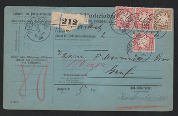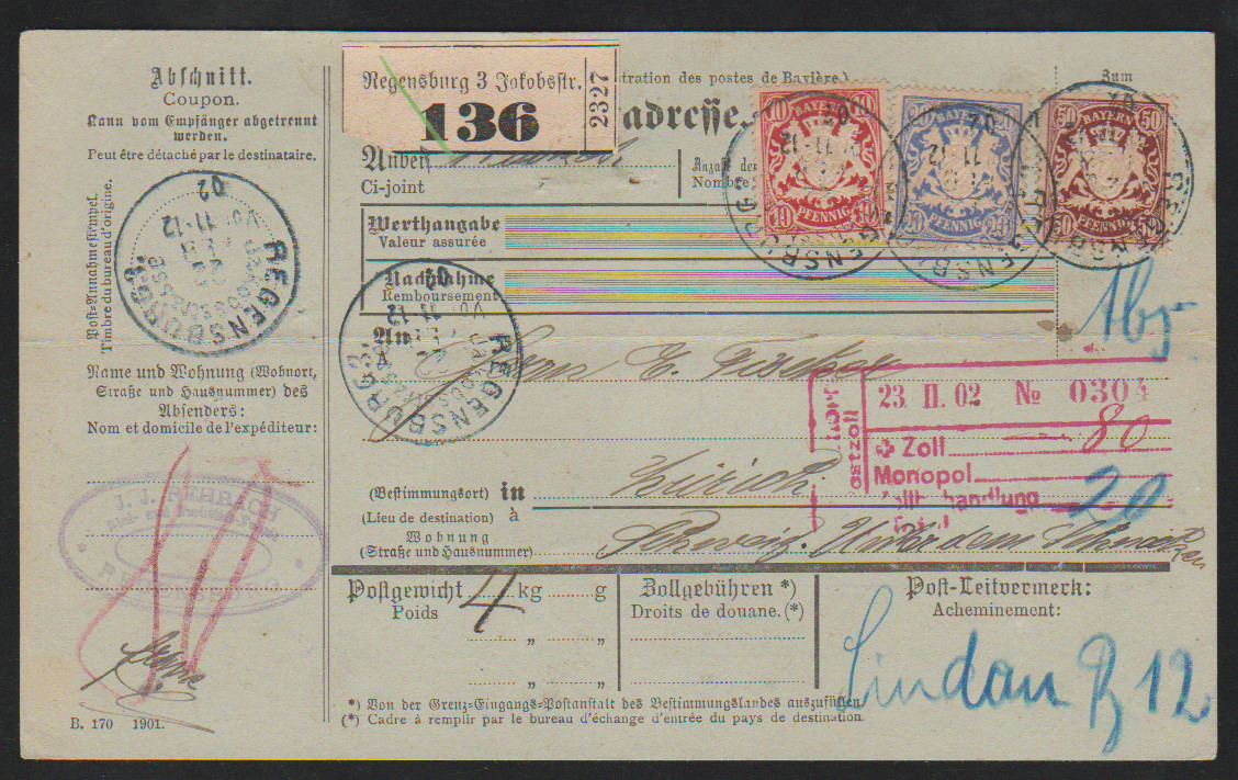 Drei Auslands-Paketkarten 1889-1910 in die Schweiz, zweimal mit versch. Mischfrankaturen 50 Pfg. (einmal "eckrund") bzw. 80 Pfg. einzeln