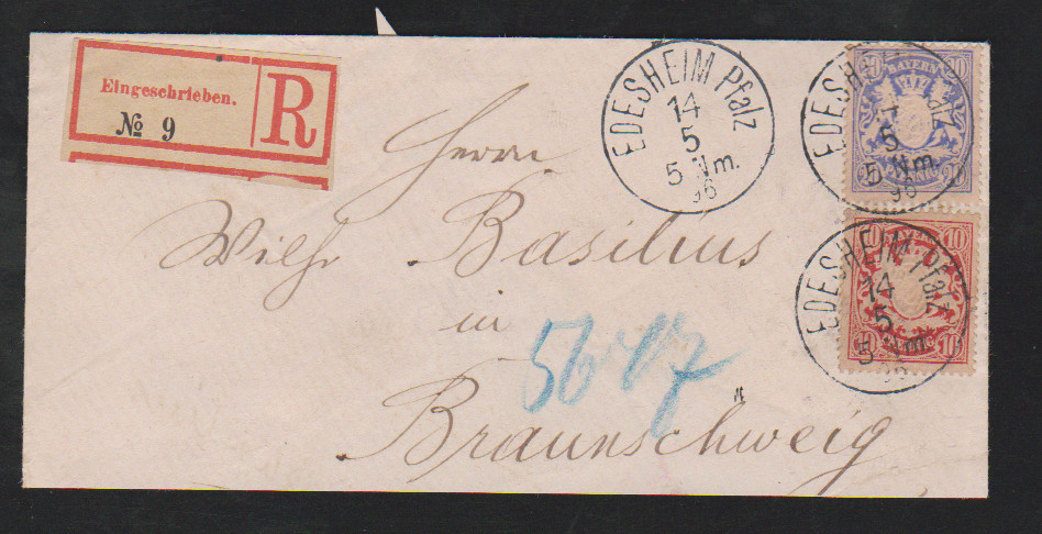 20 Pfg. in guter Farbe violettultramarin, nebst 10 Pfg., auf Einschreibecouvert (rs. fehlt ein Teil der unteren Viertelklappe) von Edesheim 1896 nach Braunschweig, sign. Sem. Mi. 250,-
