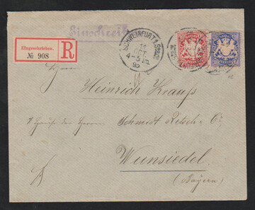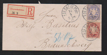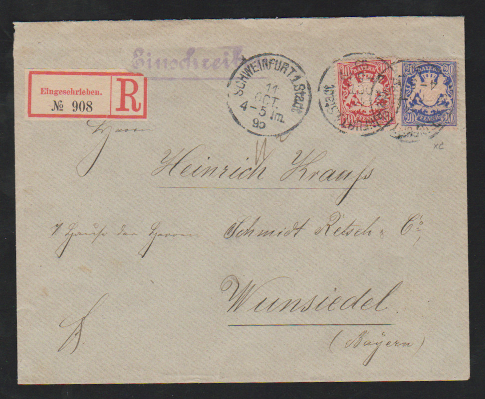 20 Pfg. in guter Farbe violettultramarin, nebst 10 Pfg., auf R-Brief aus Schweinfurt 1895, sign. Helbig. Mi. 250,-